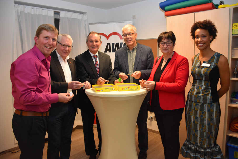 Ergänzend zu den umfangreichen Leistungen des AWO-Sozialzentrums Neuburg wurde nun auch eine Frühförderstation in Eichstätt eröffnet. Darüber freuten sich im Bild von links: Einrichtungsleiter Peter Kopischke, Dritter Bürgermeister Gerhard Nieberle, AWO-Vorstandsvorsitzender Dieter Egger, der Leiter des AWO-Sozialzentrums in Neuburg Stefan Langen, stellvertretende Landrätin Rita Böhm und Diplompädagogin und Koordinatorin Cora Beck. (Foto: Tina Steimle/Donaukurier)