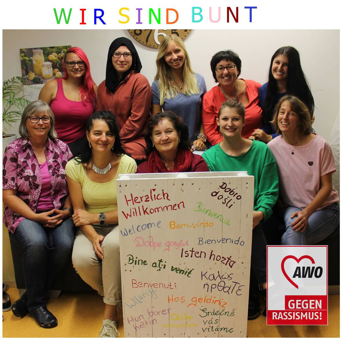 Einrichtungsleiterin Silke Heuberger: „Das neue Teamfoto war uns ein Bedürfnis… - weil wir so „bunt“ sind! Ich als Leitung freue mich auch darüber, dass die neuen Kolleginnen mit all ihren Fähigkeiten so vielfältig sind, da macht das Miteinander besonders viel Freude. Ab Oktober kommt dann noch eine Brasilianerin dazu, also wird’s noch bunter bei uns und vermutlich temperamentvoller.“