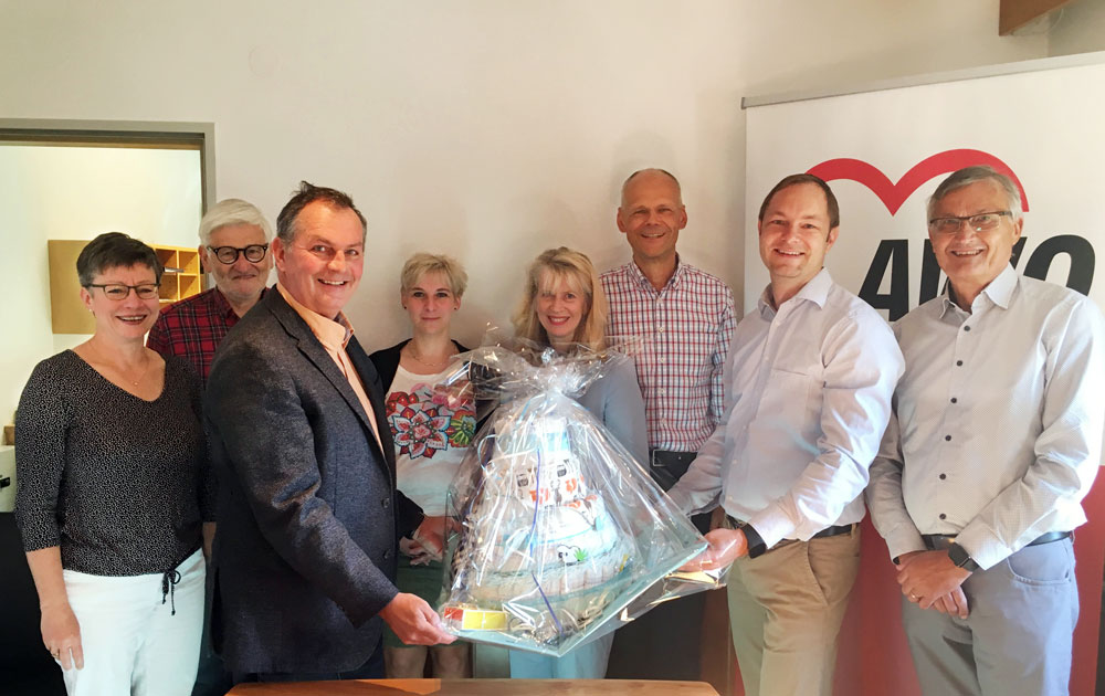 Eine schöne „Kinderwindel-Torte“ überreichte AWO-Schwaben-Vorstandsvorsitzender Dieter Egger dem langjährigen Altenhilfereferenten Volker Fritzer bei dessen Verabschiedung. So ist er für seine künftigen Aufgaben gut gerüstet. Seine Nachfolge übernimmt Sabine Polzer, die ihn „aus dem eigenen Stall heraus“ schon viele Jahre begleitete. AWO-Schwaben-Präsidium, -Vorstand, -Altenhilfeteam sowie -Kolleginnen und -Kollegen wünschen alles Gute!