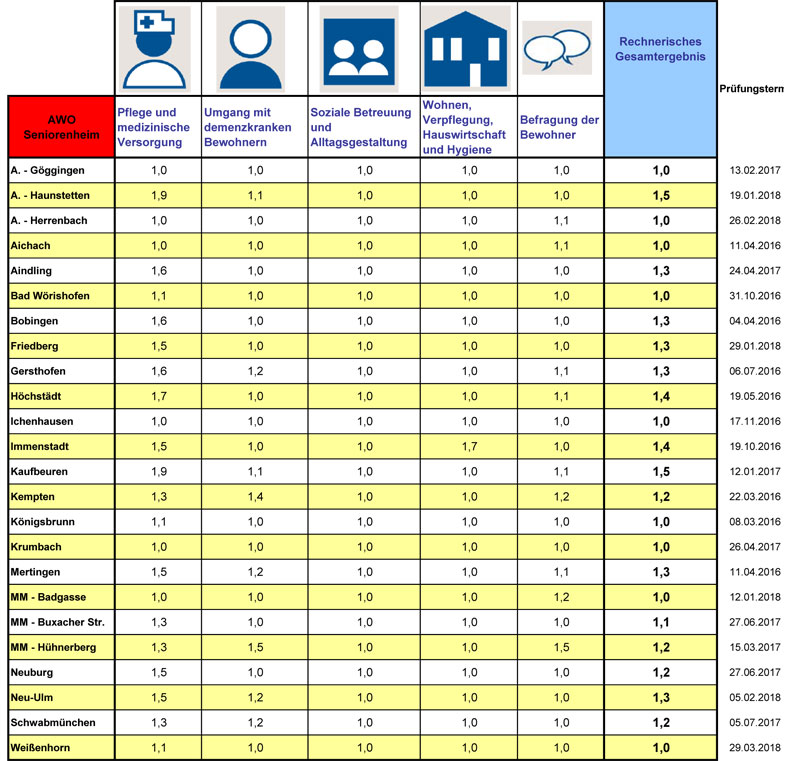 24 Seniorenheime der schwäbischen AWO haben sich dem sogenannten „Pflege-TÜV“ unterzogen. Bei den neuerlichen Qualitätsüberprüfungen seitens des Medizinischen Dienstes der Krankenkassen (MDK) schnitten die Einrichtungen hervorragend ab. 24 Seniorenheime der schwäbischen AWO haben sich dem sogenannten „Pflege-TÜV“ unterzogen.