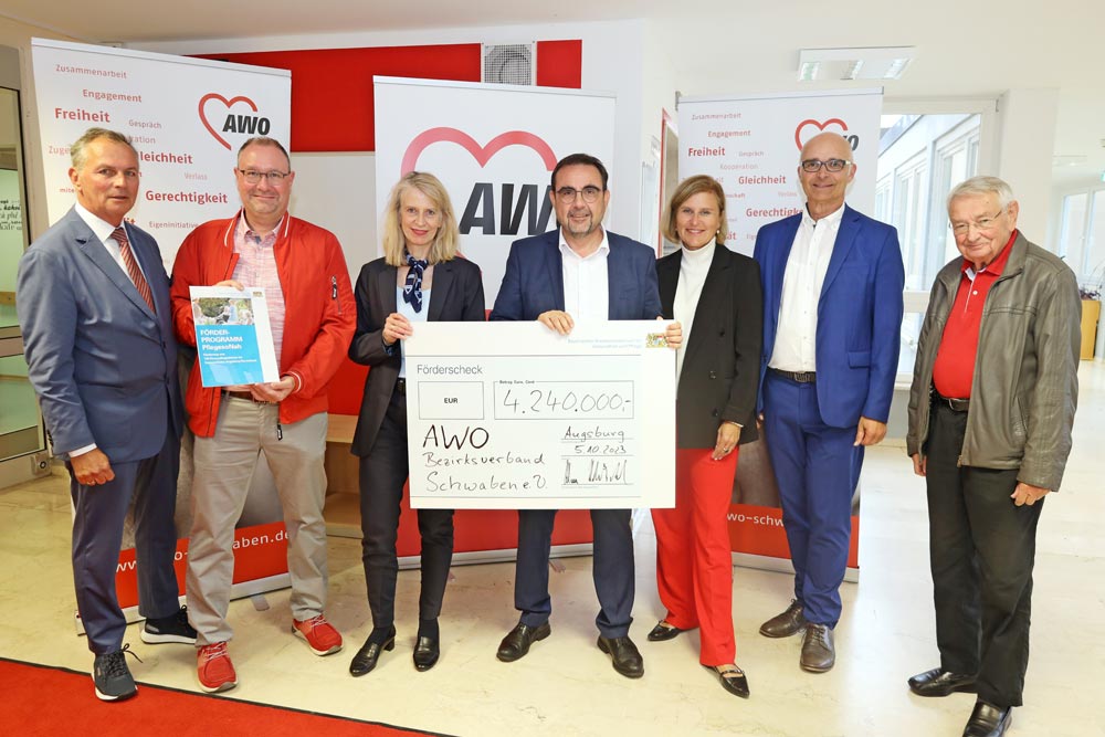Der Jubel war groß, als die Nachricht ankam: Das Bayerische Staatsministerium für Gesundheit und Pflege wird das neu zu errichtende AWO-Seniorenheim im Augsburger Stadtteil Herrenbach mit einem Betrag von 4,2 Mio. Euro fördern. Den Förderbescheid gemäß der Richtlinie „Pflege im sozialen Nahraum“ überreichte der Gesundheits- und Pflegeminister Klaus Holetschek höchstpersönlich und lobte das Projekt als „vorbildlich“. Marion Leichtle-Werner, AWO-Schwaben-Vorständin für Bau und Finanzen, erläuterte das Vorhaben, das bauliche und konzeptionelle Elemente der Demenzsensibilität und Multikulturalität beinhaltet. „Wir freuen uns, dass wir mit unserem Konzept überzeugen konnten.