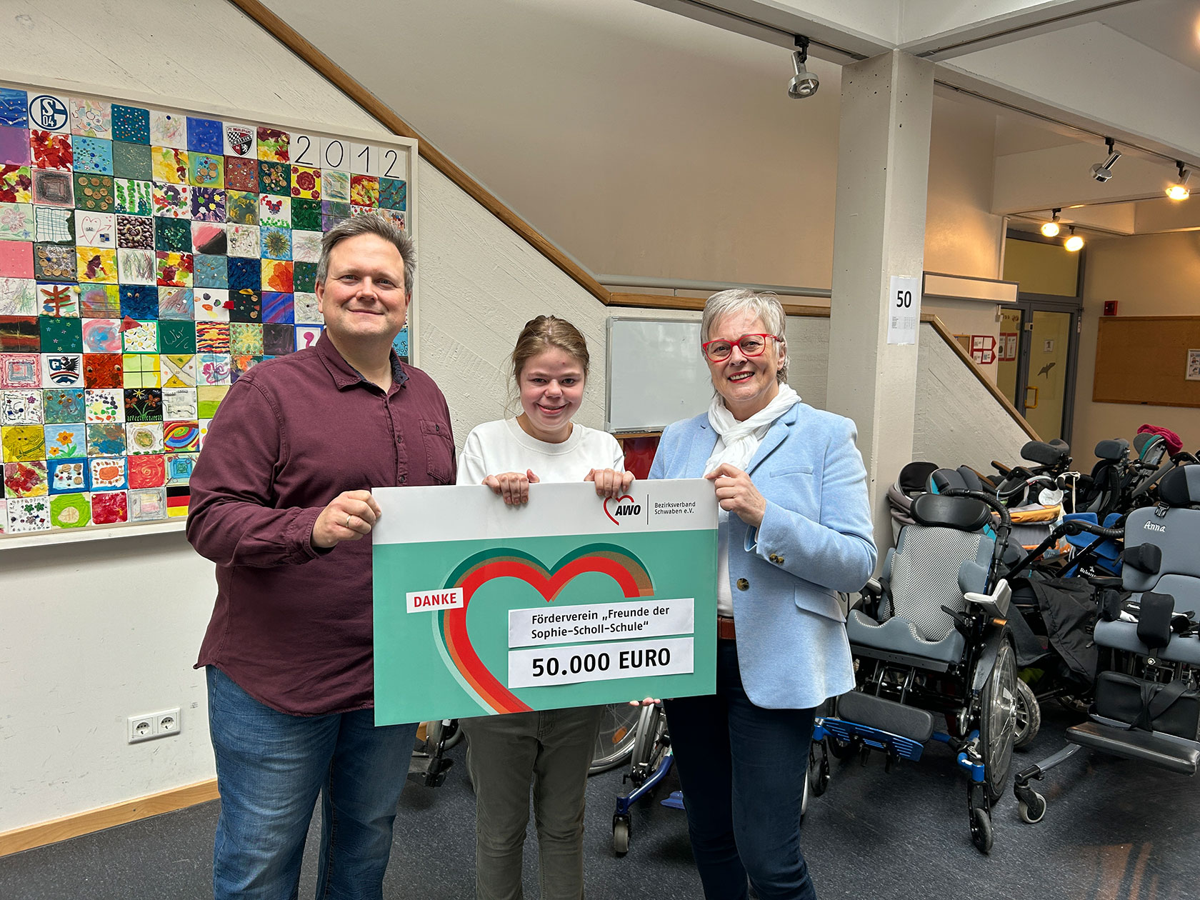 Der Förderverein „Freunde der Sophie-Scholl-Schule“ e. V. unterstützt den geplanten Neubau der Schule mit einer Spende in Höhe von 50.000 Euro. Gerhard Hagl, Vorsitzender des Fördervereins, übergab heute die Spende an die AWO Schwaben als Träger der Einrichtung. „Die Arbeit der Sophie-Scholl-Schule ist von unschätzbarem Wert. Als Vater weiß ich aus eigener Erfahrung, wie wichtig es ist, dass Kinder mit Behinderungen in einem Umfeld lernen und wachsen können, das ihre besonderen Bedürfnisse berücksichtigt“, erklärt Gerhard Hagl, dessen 15-jährige Tochter selbst seit über zwölf Jahren die Einrichtung besucht. Die Summe von 50.000 Euro konnte der Förderverein durch Zuwendungen von Seiten der Audi AG (Weihnachtsspende der Belegschaft), MediaMarktSaturn (Mitarbeitendenspende), Goals for Kids, Sonax GmbH sowie viele Einzelspender*innen und den Mitgliedsbeiträgen aufbringen.